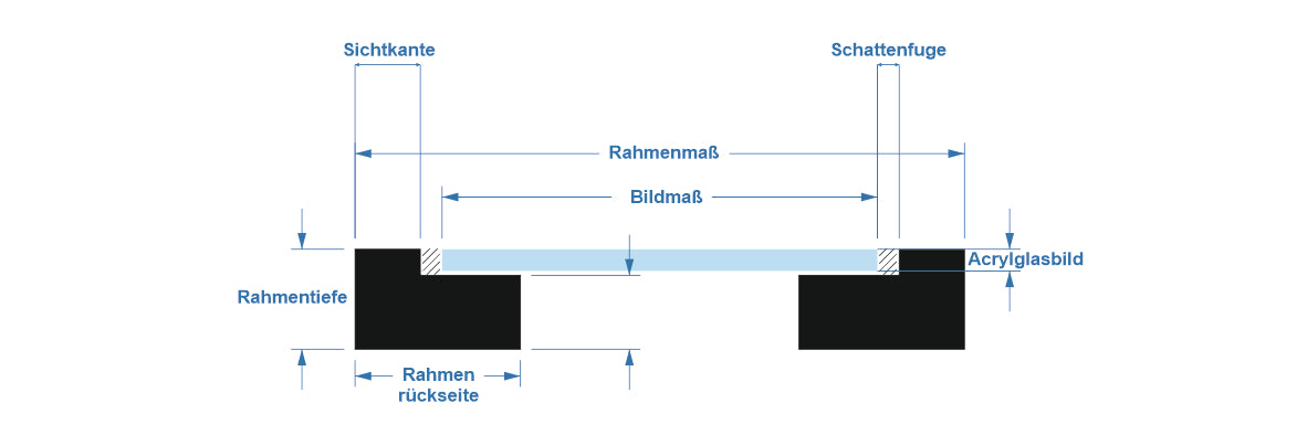 Unsere Schattenfugenrahmen haben eine Sichtkante von 1 cm und eine Tiefe von 3,5 cm. Die Schattenfuge ist 5 mm breit. Durch sie scheint es, als würde das Leinwandbild im Rahmen schweben.Bilder aus Acrylglas mit Rahmen